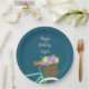 Créez des plaques de papier personnalisées qui sont parfaites pour lancer des fêtes pour les femmes qui aiment faire de la randonnée en ville sur leur vélo. Ces accessoires de fête illustrent le vélo d'une femme en vert menthe avec un pneu couleur crème et un panier sur le devant rempli de fleurs colorées. Le graphique est placé contre un arrière - plan turquoise sombre avec votre message ci-dessus en lettres de script couleur crème.