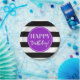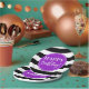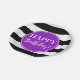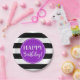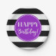 assiettes de fête d'anniversaire joyeux en violet noir et blanc rayures motif.
