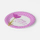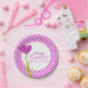 Plaques de papier tulipe pâques modernes en vert violet et blanc. Jolie aquarelle tulipe et une bordure en pois de polka. Les plaques peuvent être personnalisées avec votre propre nom de famille ou événement de Pâques. Art et design originaux de l'aquarelle par Sarah Trett. www.sarahtrett.com pour www.mylittleeden.com