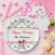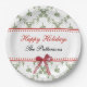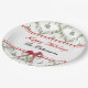 Happy Holidays Mistletoe Red Bow Custom Christmas Paper Plates Plaques de fête dispose d'élégante et élégante aquarelle vert mistletoe florale accentuée avec un arc rouge avec le texte superposition "Happy Holidays" dans la typographie de script de calligraphie moderne et personnalisée avec votre nom de famille ou texte personnalisé. Ajoutez une touche de finition élégante et élégante à votre cadre de table de vacances pour Noël et les vacances. Conçu par ©2025 Evco Studio www.zazzle.com/store/evcostudio