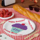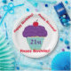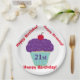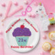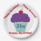 Assiettes de fête jetables pour 21 ans. Personnalisez pour n'importe quel âge, ou insérez un nom ou laissez vide. Mmm... Gâteaux Cupcakes Vanille avec Glaçage Violet et une Cerise Rouge sur le dessus avec un emballage cupcake plissé bleu clair. 'Joyeux Anniversaire' est écrit en rouge sur fond blanc. Personnalisez pour Tout Âge. Œuvre originale de TamiraZDesigns.