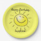 Ensemble de huit plaques de papier de 9 pouces avec une image d'un soleil jaune souriant et le sentiment optionnel "Joyeux anniversaire, soleil! Voir la boîte à bonbons, la tasse, le lanceur, le verre abattu, la théière et les dessous de verre correspondants. Voir l'ensemble de la collection Birthday Plate dans le FOOD/BEV | Section Plats.