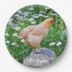 Ces assiettes d'anniversaire de poulet présentent un magnifique poulet Buff Orpington posé sur un muchroom en bois entouré d'un jardin de chaises.