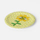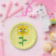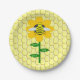 Cette incroyable plaque de fête en papier présente une image graphique d'un joli bourdon jaune avec des rayures noires, des yeux, des antennes et des jambes. Il possède de jolies ailes bleues et blanches. L'abeille est assise au milieu d'un tournesol jaune doré. La fleur a une tige verte et trois feuilles. Le message "happy bee day" (Jour heureux des abeilles) apparaît sur les trois feuilles. L'arrière - plan est composé d'un motif jaune peigne.