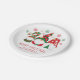 Cute plaque en papier personnalisée pour votre fête de Noël ou vaisselle de vacances avec illustrations de trois gnomes de style scandinave avec un casquette rouge et vert de saison, flocons de neige et "Joyeux Noël" et votre nom ou événement en typographie rouge.