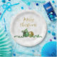 Plaques en papier de Noël avec des ornements verts et or design. Le texte "Joyeux Noël" dans le script peut être changé à tout ce que vous voulez. Un motif léger de flocon de neige recouvre les plaques blanches qui sont rondes ou carrés.