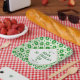 Vert blanc orange quatre feuilles clovers motif sur arrière - plan plaid avec texte modifiable "Joyeux Saint Patrick's Day" date et nom de famille facilement personnalisée, pour la fête, le dîner, le cocktail ou toute autre occasion.