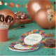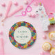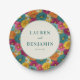 This vibrant wedding plate features a lively floral pattern with densely packed flowers in shades of orange, pink, teal, and yellow, creating a cheerful mosaic. The central circular element is framed by elegant lines, showcasing customizable text in a sophisticated serif font for names and a simple sans-serif style for the date. The design exudes a joyful and festive mood, perfect for celebrating special occasions like weddings. Its playful yet polished look makes it an ideal choice for adding a touch of elegance to your event decor.