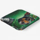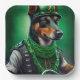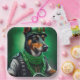 Un ami en fureur derrière les guidons d'une moto verte brillante, portant une tenue verte de la Saint Patrick qui fait tourner la tête. Le chien est habillé d'un ensemble festif, avec une cravate arc-en-ciel verte et un chapeau haut assorti qui se trouve doucement au-dessus de la tête. Le costume présente des motifs complexes de shamrocks et de leprechauns, ce qui indique clairement que ce chien est prêt à célébrer la Saint Patrick avec style.