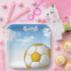 This cheerful illustration features a classic yellow and white soccer ball set against a bright blue sky with soft clouds, creating a clean and uplifting sports vibe. The minimal, playful style makes it perfect for kids, young athletes, and soccer fans who love fresh and energetic visuals. Ideal for sports-themed designs that celebrate movement, fun, and a love for football in a light, modern way.