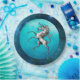 Illustration de licorne de style héraldique vintage en étain sur disque bleu aquarelle avec arrière - plan céleste plus foncé.