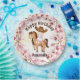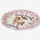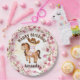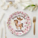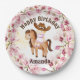 Mignonne petite cowgirl selle les assiettes de fête personnalisées d'anniversaire. Cowgirl à cheval de bébé mignon et fleurs roses. Couleurs Brown et jaune rose de la ferme.
