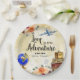 Traveling Love est une aventure nuptiale plaques de douche. Le design comprend des bagages vintages, un globe terrestre, un avion, un passeport et une aquarelle à motifs floraux. Douche nuptiale à thème Voyage.