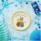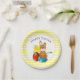 Définissez une table de vacances de Pâques festive avec ces adorables assiettes en papier. Ces assiettes de fête présentent un lapin de Pâques tenant un pinceau avec trois œufs colorés. Le design de l'assiette est présenté sur un élément blanc avec un fond rayé jaune et blanc. Personnalisez le texte avec vos propres mots ou achetez comme indiqué avec le message "Joyeuses Pâques".