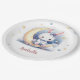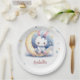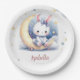 Super mignonne plaque en papier avec un mignon petit lapin blanc portant une belle proue violette assise sur une lune jaune avec quelques étoiles en chute d'or.