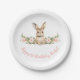 Plate de papier de première anniversaire de fille lapin à fleurs roses.