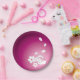 Un ensemble de plaques en papier violet avec une illustration de deux lapins à neige japonais, deux fleurs de sakura et quatre pétales de fleurs de sakura dans le coin inférieur droit, laissant de l'espace pour le texte (si nécessaire) à gauche. Idéal pour les fêtes culturelles !