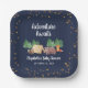 De jolies plaques en papier pour son baby shower, illustrant une illustration d'animaux en bois avec leur tente campant dans les montagnes et la forêt, une superposition d'étoiles dorées, et "Adventure Awaits" et le nom de la future mère en écriture blanche contre un arrière - plan bleu minuit.