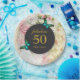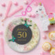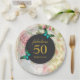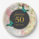 Une plaque de papier d'anniversaire - fabuleux 50 avec un nom personnalisé. Conçu avec d'élégants papillons verts. Un cadre circulaire noir au centre superpose un motif vintage avec des roses roses roses noires et des feuilles d'or vert avec un look vieillot et désuet.