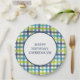 Ces assiettes en papier rond personnalisées de bon goût sont parfaites pour ajouter une touche spéciale aux fêtes. Ils sont prêts à être customisés avec votre propre message et disposent d'un style de chèque plaid qui a une sensation de preppy avec des bandes d'intersection dessinées à la main de vert citron, bleu turquoise et bleu marine ensemble contre un arrière - plan blanc.