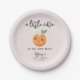 Plate de papier baby shower à thème mignonne "petite mignonne" illustrant une mandarine orange avec une fleur blanche et une feuille verte avec un joli sourire et des joues roses. Le texte dit "un peu mignon est en route !" Idéal pour la douche d'une fille.