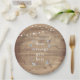 Une assiette en papier de campagne rustique avec des lumières de corde au-dessus d'un vieux bocal mason rempli de votre message personnalisé et de délicates fleurs sauvages dispersées sur un fond de panneau de bois naturel patiné. Parfait pour les mariages, les fêtes de fiançailles, les baby showers, les baptêmes, les fêtes d'anniversaire de mariage, les remises de diplômes, les réunions d'anniversaire et d'autres événements spéciaux tout au long de l'année ! Conçu par Thisisnotme