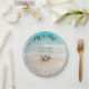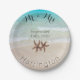 Starfish couple plaques en papier mariage avec trois zones de texte personnalisé. "M. et Mme" en haut, avec le nom de famille marié en bas, tourne autour du bord de l'assiette. Date du mariage et deux étoiles de mer brunes au centre. Tout est imprimé sur une scène de plage d'eau turquoise qui enjambe doucement la plage de sable.