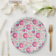 Un ensemble délicieux de plaques en papier avec un design motif délicieux. Des beignets rose vernis avec des arroses. Serviettes d'arrosage à la bouche en rose et bleu avec rosettes et fraises sur le dessus. Des macarons de pâtisserie rose pastel et de petits boutons de bonbons roses décorent également ce motif plein de douceurs.