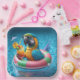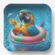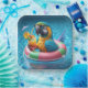 Perroquet tenant un verre dans un anneau gonflable dans une piscine