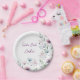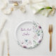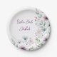 Belles assiettes en papier personnalisées pour mariage "Mangeons du gâteau". Un élégant design floral aquarelle avec des fleurs de prune pourpre, feuillage de sauge vert et poussiéreux bleu. Celles-ci sont belles pour un dîner de réception de mariage ou pour une douche de mariée ou une soirée entre filles.