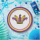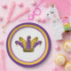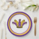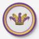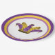 Casquette Mardi Gras Jester avec motif arlequin en violet et or. La plaque a aussi des bordures violettes et de goad.