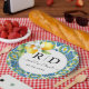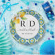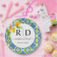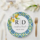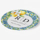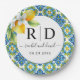 Assiette en papier pour mariage aux carreaux bleus et jaunes méditerranéens et branche avec citrons et fleurs. Une ambiance ensoleillée et joyeuse est capturée dans ce design de mariage d'inspiration méditerranéenne. Le motif de carreaux bleu et jaune saisissant rappelle immédiatement la côte italienne, tandis que l'ajout de branches de citron élégantes en fleurs dans le coin supérieur gauche fait subtilement référence à l'esprit de "La Dolce Vita". L'assiette est à la fois sophistiquée et invitante, parfaite pour un mariage qui cherche à refléter la beauté et la chaleur d'un été italien. Les initiales et les noms du couple sont incorporés dans un cadre rond, offrant une présentation accrocheuse et facilement compréhensible des informations essentielles.