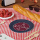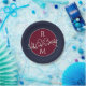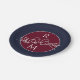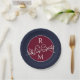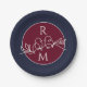 Élégante, moderne, simple assiette en papier bordeaux et bleu nuit pour mariage, avec les initiales du monogramme de la mariée et du marié et dessin unique de tourtereaux.