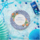 Oranges peintes à la main sur un fond inspiré d'un vieux carreau bleu et blanc. Si vous préférez le cercle central avec un bord simple (plutôt que festonné), cette option est disponible. Sous les zones de personnalisation du texte, "cliquez pour personnaliser davantage", puis allez dans la zone "calques" et affichez "ovale" et masquez le calque de cercle festonné.
