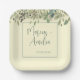 Jolie assiette en papier pour mariage avec une bordure de feuilles d'eucalyptus aquarelle sur fond crème et des blocs de texte verts personnalisables dans des polices modernes