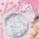 Magnifiques roses bleus et ivoire poussiéreux avec des rubans pendants faits dans des aquarelles douces. Ajoutez les noms et la date à personnaliser. Parfait pour votre mariage ou occasion spéciale.