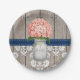 La plaque à papier décorée d'un monogramme de pot de maçon de style assez rustique avec une fleur de corail d'hortensia de pêche et une barrière et une damassé en bois d'antiquité modèlent l'arrière - plan de dentelle et le ruban hued piqué de bleu marine. Ces mariage ou douche nuptiale ou douche de couples, plat de fiançailles ou de fête d'anniversaire personnalisé avec les initiales et le monogramme des couples heureux ou jeunes mariés sur le pot de maçon est parfaite pour un pays, une ferme, une réception en plein air ou une occasion spéciale ou une célébration de style de basse-cour. Conçu par Chrissy H. Studios, LLC. Tous droits réservés.