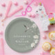 Ces assiettes en papier pour mariage de jardin floral de chinoiserie vert sauge moderne peuvent être personnalisées avec vos informations dans une typographie élégante. Conçu par Thisisnotme©