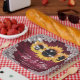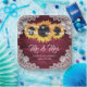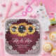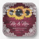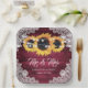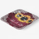 Plaques de papier mariage bordeaux personnalisées ornées de tournesols sur un arrière - plan en bois de grange orné de dentelles fleuries blanches et de lampes à cordes. Des articles assortis disponibles pour compléter ces assiettes de papier mariage chic et bordeaux inspirées des tournesols.