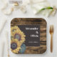 Personnalisez une plaque en papier unique pour les invités de mariage avec un ensemble de Plaques en papier Mariage de tournesol rustique. Le design de Plaque de Papier comporte un trio de tournesols aquarelle contre un arrière - plan rustique en bois. Personnalisez avec les noms du marié et de la mariée avec la date du mariage. Papier à lettres mariage supplémentaire disponible avec cette conception aussi.