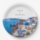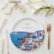 Ces assiettes en papier pour mariage à Santorin Grèce à l'aquarelle élégantes peuvent être personnalisées avec vos informations en typographie moderne. Conçues par Thisisnotme©
