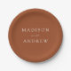 Les élégantes plaques de papier mariage en terre cuite personnalisées sont parfaites pour votre réception de mariage, dîner de répétition, fête de fiançailles, et plus encore! Les assiettes minimalistes en terre cuite mariage sont parfaites pour les mariages d'été, d'automne, d'hiver et de printemps. Le design comprend un script de calligraphie moderne chic avec vos noms en lettres blanches sur un arrière - plan en terre cuite. Le design s'harmonise avec notre collection de mariage en terre cuite moderne Elegance.