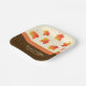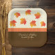 Plaques de papier pour un mariage d'automne avec des feuilles d'érable de couleur brillante, un ruban plaid et un arrière - plan marron. Une façon saisonnière de servir des gâteaux à la réception. Inclure le nom de la mariée et du marié et la date du mariage.