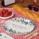 Assiettes en papier avec un joli motif floral réalisé à l'aquarelle. Fleurs de jardin roses, violettes et vertes.
