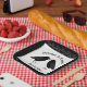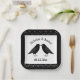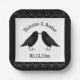 Cet ensemble impressionnant de plaques de Mariage carré en papier présente l'image art numérique d'une paire de beaux corbeaux noirs faisant face et ressemblant à des baisers. Elles sont noires avec les yeux béatifiés et les pieds et les becs gris. Il y a aussi des étoiles blanches sur un arrière - plan noir au-dessus et au-dessous des oiseaux. Il y a du texte personnalisé pour que vous puissiez inclure les noms du couple heureux et la date du Mariage.