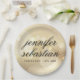 Assiettes en papier de mariage chic et sophistiquées avec noms ou monogramme et date de mariage.