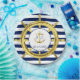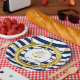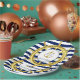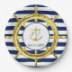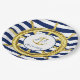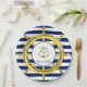 Poursuivez le thème de mariage à rayures nautiques avec les assiettes en papier assorties. Un gouvernail doré est frappant sur les rayures classiques bleu marine et blanc. Au centre, une ancre dorée avec les initiales de la mariée et du marié, et la date du mariage.