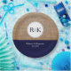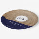 Cette plaque en papier mariage simple et moderne offre un cercle blanc avec le monogramme de la mariée et du marié sur une photo de burlap comme arrière - plan. Texte personnalisable sur un arrière - plan bleu marine foncé près du fond, avec les noms de la mariée et du marié et leur date de mariage.