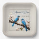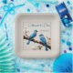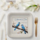 Personnalisez une plaque en papier unique pour les invités de réception de mariage avec un ensemble de Plaques en papier Mariage Spring Bluebirds. Papier La conception de plaque comporte une paire de bleuets reposant sur une branche en bois avec des fleurs de printemps contre un arrière - plan texturé en papier. Personnalisez avec les noms du marié et de la mariée avec la date du mariage. Papier à lettres mariage supplémentaire disponible avec cette conception aussi.