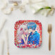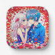 Garçon et fille d'anime se câlinant entourés de fleurs colorées. Joli couple d'anime, fille aux cheveux roses et garçon aux cheveux bleus. Les couleurs sont rouge, bleu, blanc, rose et violet. Joli pour les mariages, la Saint-Valentin ou un anniversaire.